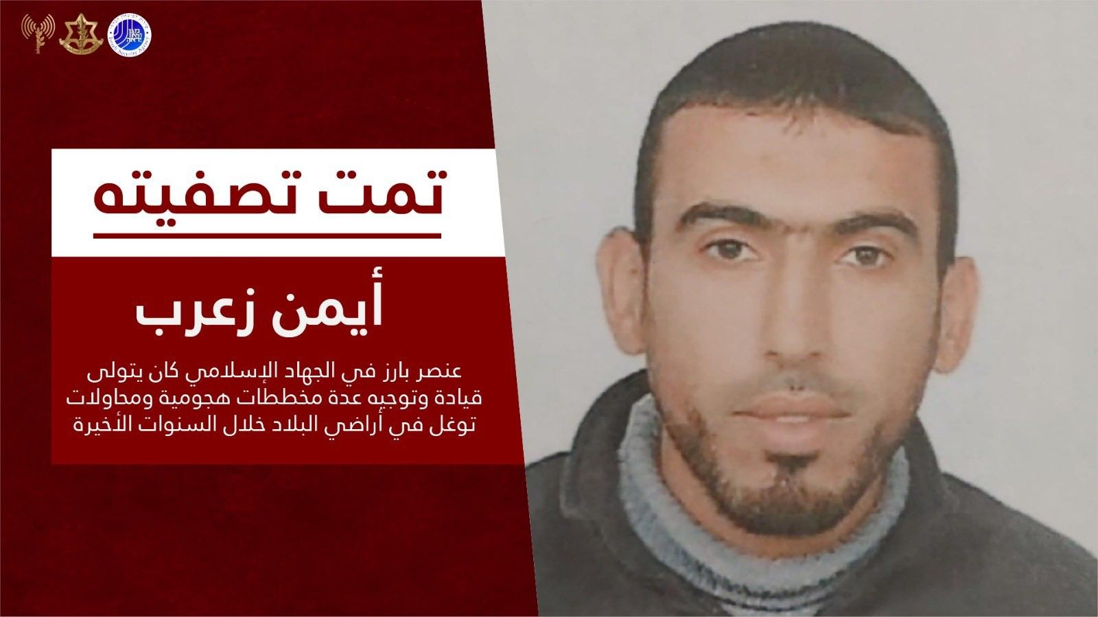 وقال المتحدث باسم جيش الاحتلال في بيان صحفي إنه وفي عملية مشتركة بين الجيش والشاباك ، تم في وقت سابق اليوم، اغتيال أيمن زعرب مسؤول سرايا القدس في رفح، الذي كان قد تولى قيادة وتوجيه عدة عمليات وقاد شخصياً خلال السنوات الماضية عدة محاولات اقتحام نحو الأراضي الإسرائيلية.