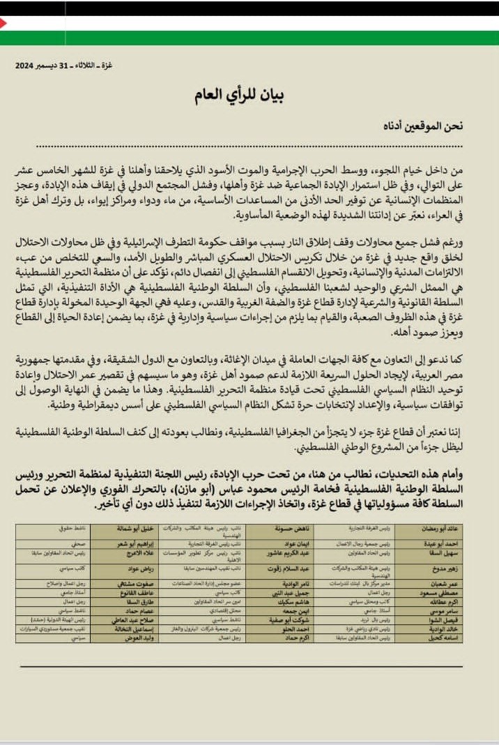 وأمام هذه التحديات، نطالب من هنا، من تحت الإبادة، رئيس اللجنة التنفيذية لمنظمة التحرير ورئيس السلطة الوطنية الفلسطينية، بالتحرك الفوري والإعلان عن تحمل السلطة كافة مسؤولياتها في قطاع غزة، واتخاذ الإجراءات اللازمة لتنفيذ ذلك دون أي تأخير.