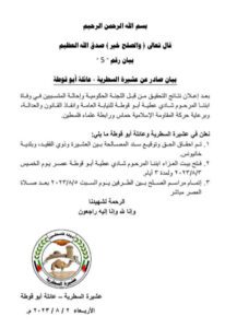 أصدرت عشيرة السطرية (عائلة أبو قوطة) في قطاع غزة، مساء اليوم الأربعاء، بياناً للرأي العام حول مستجدات وفاة ابنهم شادي أبو قوطة خلال قيام طواقم بلدية خانيونس بإزالة تعديات مطلع الأسبوع الجاري.