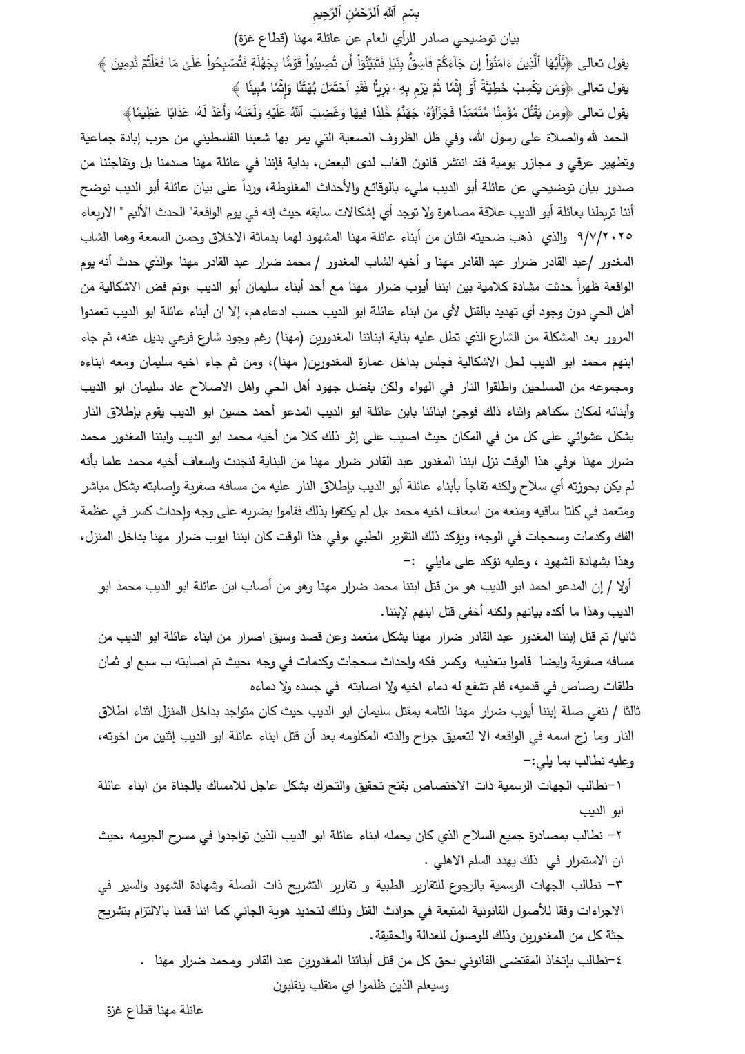 عائلة “مهنا” تصدر بياناً للرأي العام بعد حادثة مقتل إثنين من أبنائها بدير البلح وسط قطاع غزة