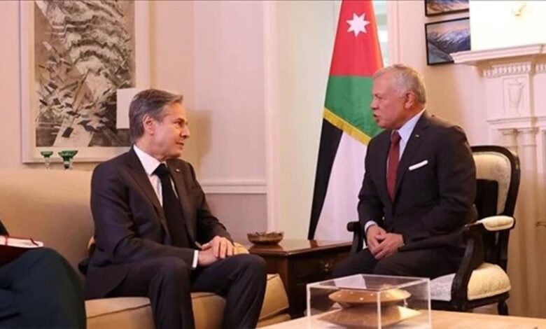 حديث الملك عبد الله الثاني جاء خلال لقائه وزير الخارجية الأمريكي أنتوني بلينكن، بالعاصمة عمان، في إطار زيارة رسمية يجريها الأخير إلى الأردن، وفق بيان للديوان الملكي، تلقت الأناضول نسخة منه.