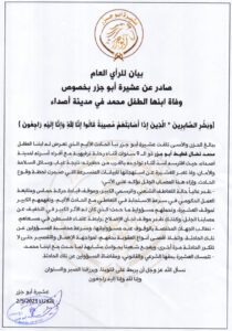 عشيرة أبو جزر”قطيط” تصدر بيان للرأي العام بشأن حادثة وفاة ابنها محمد