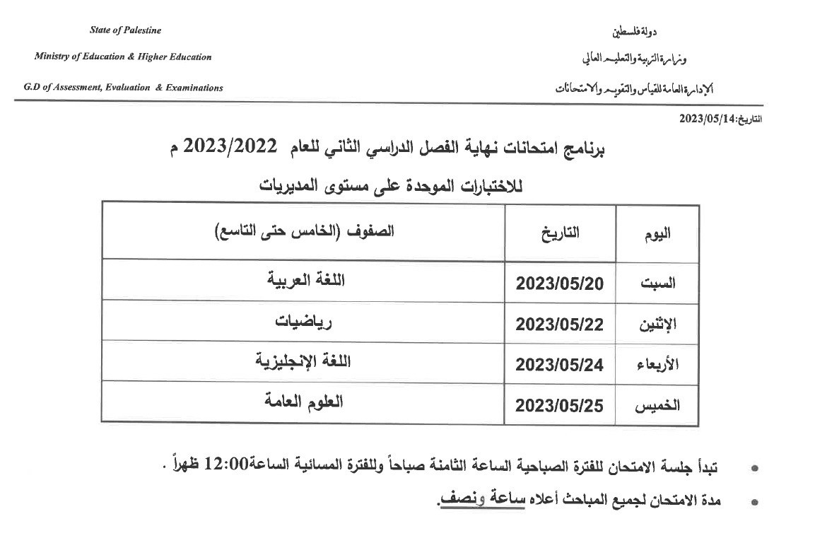 نشرت وزارة التربية والتعليم العالي – الإدارة العامة للقياس والتقويم والامتحانات جدول امتحانات نهاية الفصل الدراسي الثاني للعام 2022/2023م من الصف الخامس الأساسي وحتى الصف الحادي عشر بفروعه، للاختبارات الموحدة على مستوى المديريات.