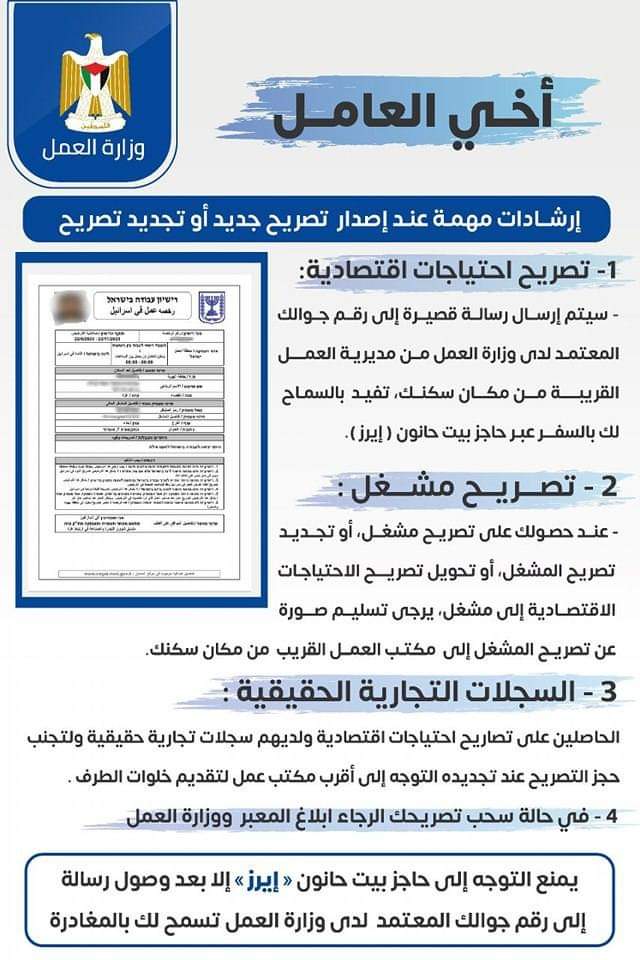 وأردفت الوزارة أنه في حالة سحب التصريح يجب ابلاغ المعبر ووزارة العمل، مضيفةً بأنه يمنع التوجه إلى حاجز بيت حانون إيرز إلا بعد وصول رسالة إلى رقم الهاتف المحمول المعتمد لدى وزارة العمل تسمح بالمغادرة.
