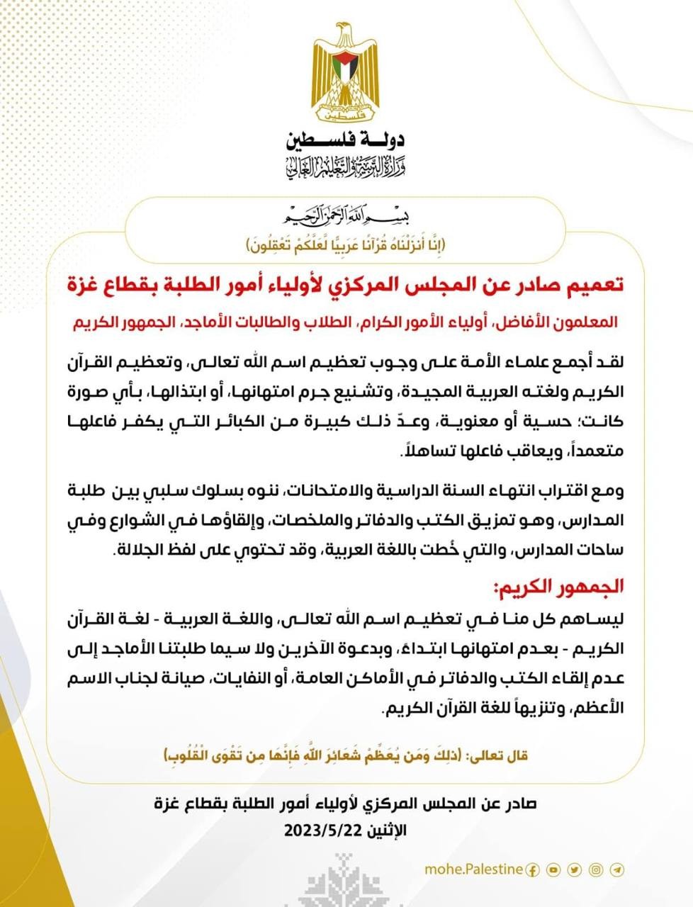 مجلس أولياء أمور الطلبة بغزة يصدر تعميما مع اقتراب نهاية العام الدراسي