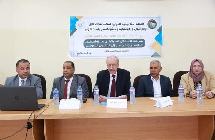 عقدت الحملة الاكاديمية الدولية لمناهضة الاحتلال والابرتهايد بالتعاون مع جامعة الازهر ندوة حوارية ” طاولة مستديرة” لمجموعة من النخب القانونية والاكاديمية بعنوان ((جرائم الاحتلال الاسرائيلي بحق اطفال فلسطين في ميزان القانون الدولي)).