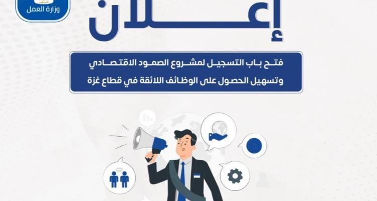 أعلنت وزارة العمل بغزة، بالتعاون مع مركز شئون المرأة، اليوم الاثنين 15 مايو 2023، فتح باب التسجيل لمشروع الصمود الاقتصادي وتسهيل الحصول على الوظائف اللائقة في قطاع غزة.