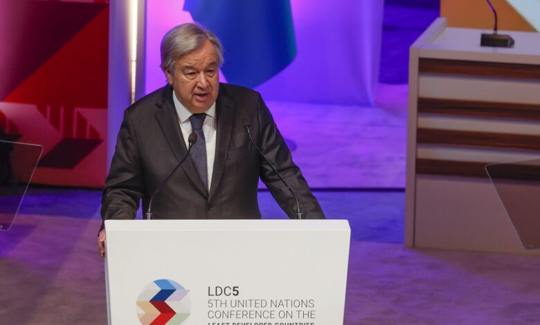 وقال غوتيريش، في قمة للقادة تسبق الانطلاق الرسمي، الأحد، في الدوحة لأعمال مؤتمر الأمم المتحدة الخامس المعني بالبلدان الأقل نموا، “على الدول الغنية تقديم 500 مليار دولار سنويا لمساعدة تلك الدول العالقة في حلقات مفرغة، تعرقل جهودها الرامية لتعزيز اقتصاداتها، وتحسين الصحة والتعليم”.