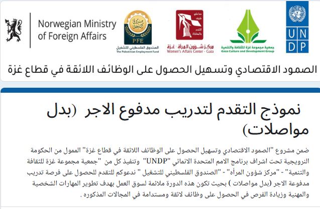 هذا المشروع التدريبي بالتعاون مع جمعيات ومؤسسات المجتمع المدني في قطاع غزة – مركز شؤون المرأة WAC وجمعية مجموعة غزة للثقافة و التنمية GCDG وبدعم وتمويل من الحكومة النرويجية و تحت إشراف برنامج الأمم المتحدة الإنمائي UNDP بهدف زيادة فرص الحصول على وظائف لائقة.