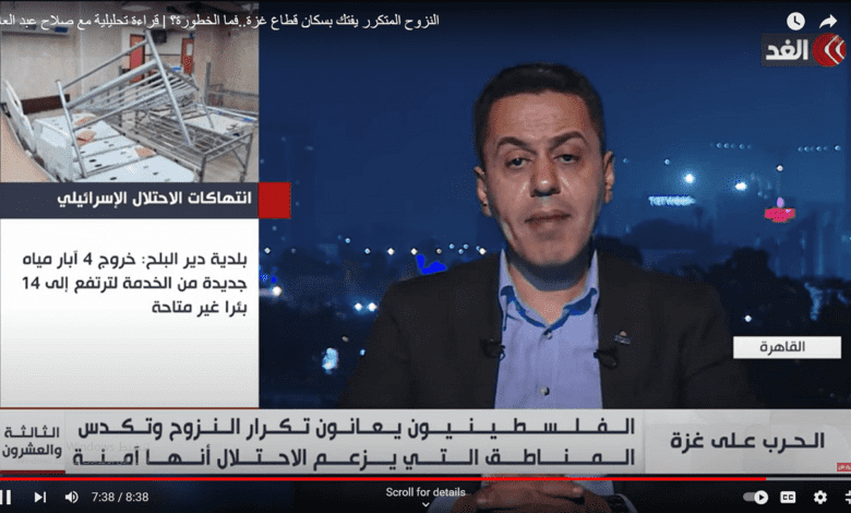وبين أن المواطنين المتواجدين في دير البلح لن يتمكنوا من الحصول على مياه الشرب، فهناك فقط من ثلاثة آبار للمياه وهذه الآبار غير تكفي، خاصة أن البلدية عاجزة عن أداء مهامها في ظل عدم توفر الوقود لتشغيل محطات المياه، كما أن المستشفى الوحيد في المنطقة الوسطى قد يضطر للخروج عن الخدمة بعد اخلائه من المرضى والصحفيين والنازحين ليبقى الأطقم الطبية والممرضين، محذراً العالم من مغبة التراخي من تهديدات الاحتلال، وأن يخرج المستشفى عن الخدمة كباقي المستشفيات في المحافظات المختلفة.