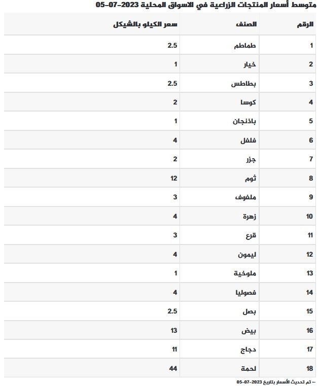 جاءت قائمة أسعار الخضروات والدجاج والبيض واللحوم في أسواق غزة اليوم الأربعاء 5 يوليو 2023، عالنحو الآتي: