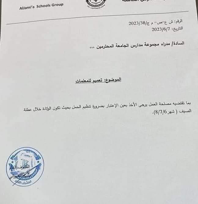تعميم المدرسة حول مواعيد ولادة المعلمات