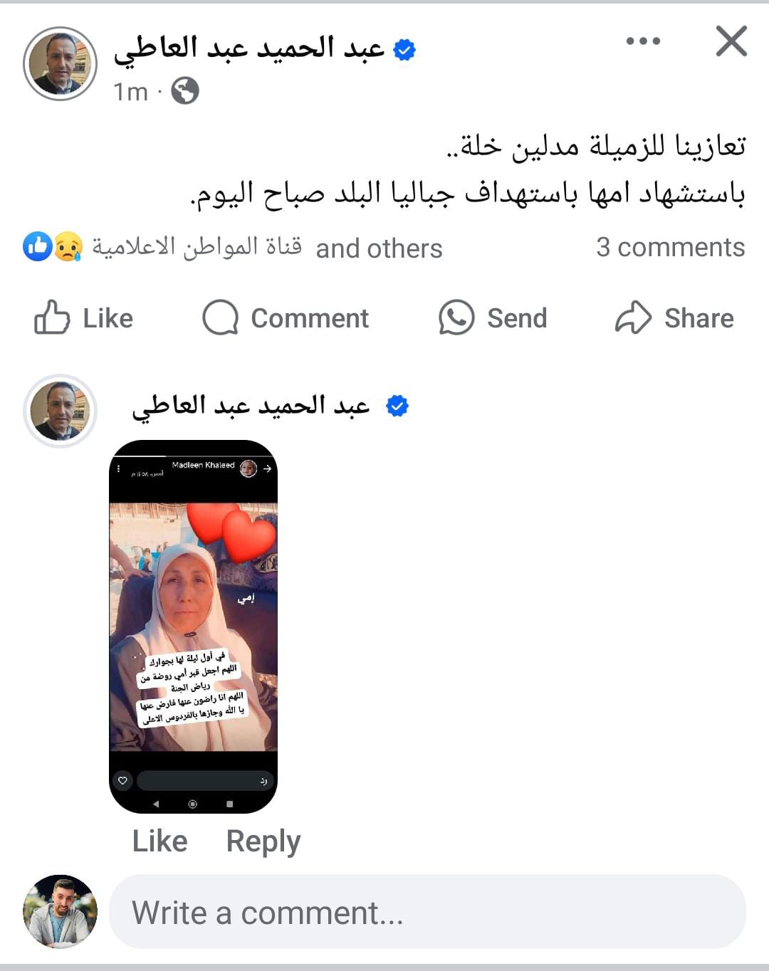 تقدمت قناة المواطن الإعلامية بخالص العزاء وعظيم المواساة للزميلة الصحفية مدلين خلة باستشهاد والدتها في قصف إسرائيلي شمال غزة.