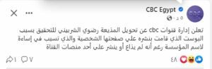 وحول التحقيق مع رضوى الشربيني .. كتبت إدارة قنوات CBC، عبر حسابها الشخصي بموقع فيسبوك، وقال: تعلن إدارة قناة CBC تحويل المذيعة رضوى الشربيني للتحقيق بسبب البوست الذي قامت بنشره علي صفحتها الشخصية والذي تسبب في إساءة لأسم المؤسسة رغم أنه لم يذاع أو ينشر على أحد منصات القناة.