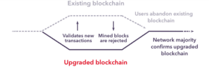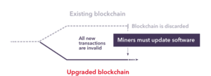 الفورك القاسي: تصبح البيانات المتسلسلة التي جرى تحديثها مسئولة الآن عن التحقق من جميع المعاملات، إلا أن البيانات المتسلسلة الحالية لم تعد قادرة على تحديد صحة هذه المعاملات أو تسجيلها. وهذا يعني أنه يجب على جميع مستخدمي البرامج القديمة إجراء عملية التحديث للوصول إلى االبيانات المتسلسلة المحدثة.