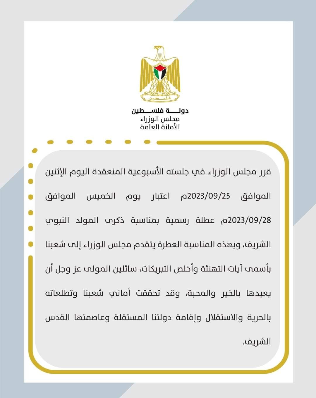 قرر مجلس الوزراء الفلسطيني، اليوم الإثنين، في جلسته الأسبوعية اعتبار يوم الخميس المقبل الموافق 28 سبتمبر 2023، عطلة رسمية بمناسبة ذكرى المولد النبوي الشريف.