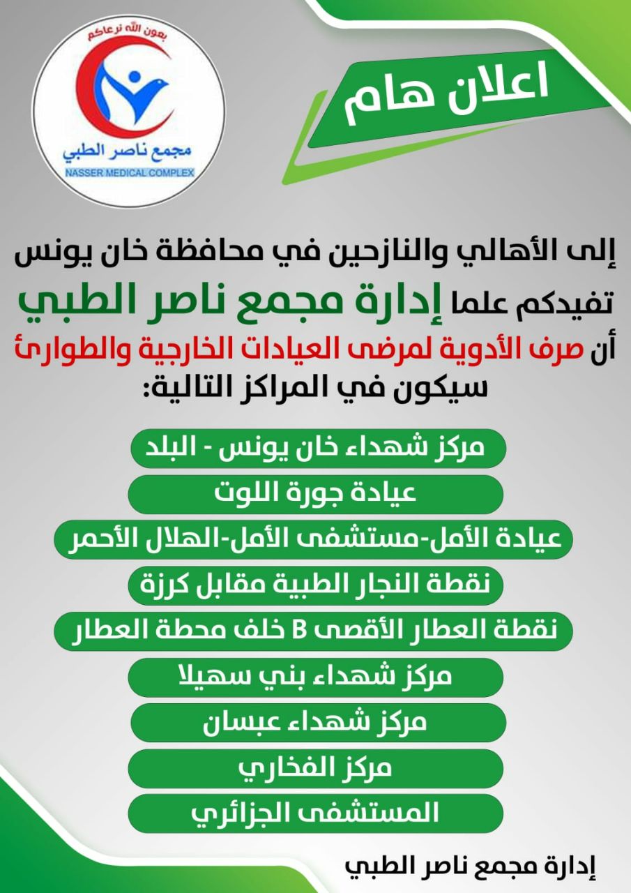 مجمع ناصر الطبي يصدر إعلان هام للمواطنين جنوب قطاع غزة