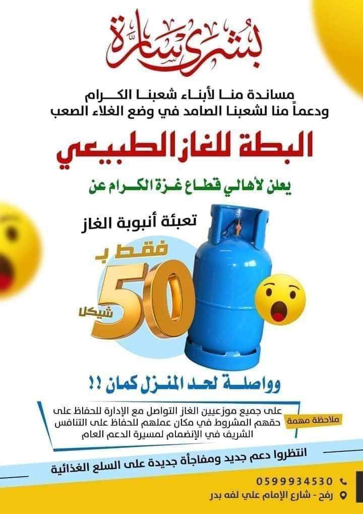 مساندة لأبناء شعبنا الكرام ودعماً للشعب الصامد في وضع الغلاء الصعب التي يمر به قطاع غزة، أعلنت محطة البطة للغاز الطبيعي عن تعبئة اسطوانة الغاز بسعر 50 شيكل.