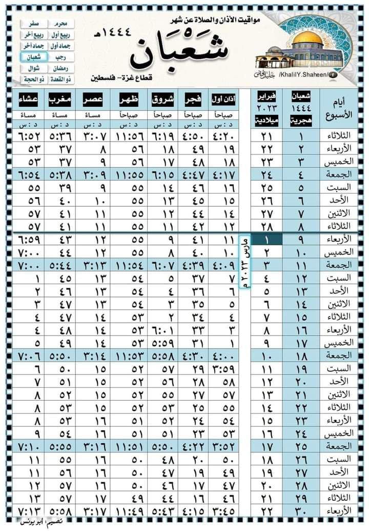 مواقيت الصلاة شهر شعبان في فلسطين 1444-2023