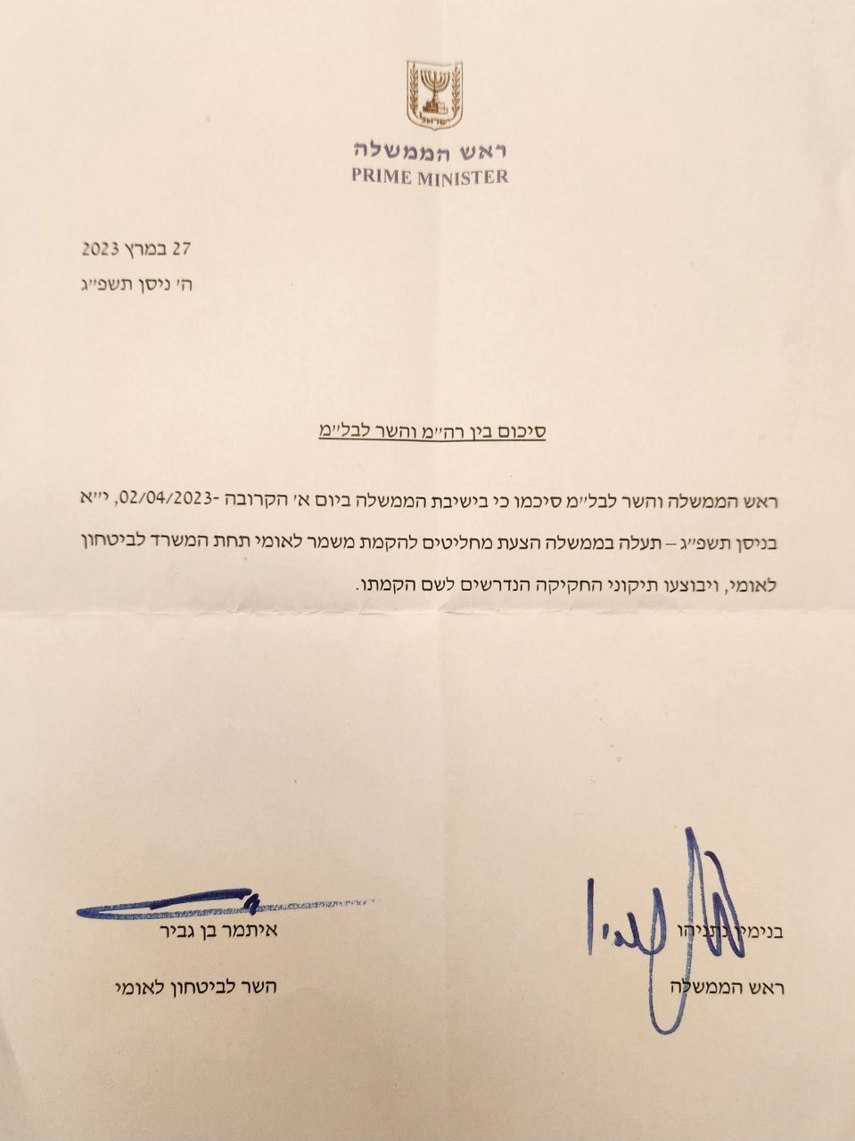 ونشرت إذاعة الجيش الاسرائيلي القرار الموقع بين نتنياهو وبن غفير على أن تقوم الحكومة في غضون أسبوع الإقرار بإنشاء حرس وطني تحت إشراف وزارة الأمن القومي.
