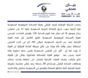 وقال بأن: “الهيئة تتابع وتراقب وترصد الهزات الأرضية وتعمل على تحليلها وتحديد مصادر ونطاقات النشاط الزلزالي باستخدام 291 محطة رصد زلزالي منتشرة بطريقة علمية لتغطية كافة مناطق المملكة والوضع في السعودية مطمئن ولله الحمد”.