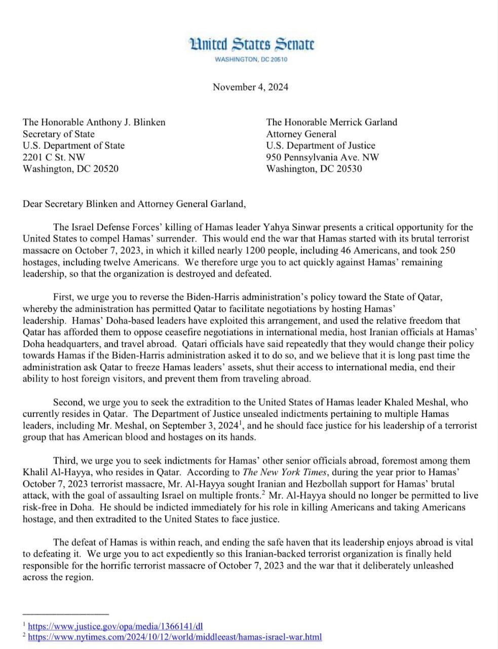 وأكدت الرسالة على ضرورة تجميد أصول قادة حماس، ومنعهم من الظهور الإعلامي، ووقف استقبالهم للزوار الأجانب أو السفر إلى الخارج. كما دعت إلى تسليم القيادي خالد مشعل للولايات المتحدة، والسعي لإصدار لوائح اتهام بحق مسؤولين آخرين في حماس، ومن ضمنهم خليل الحية المقيم في قطر، لدوره في قتل واحتجاز رهائن أمريكيين.