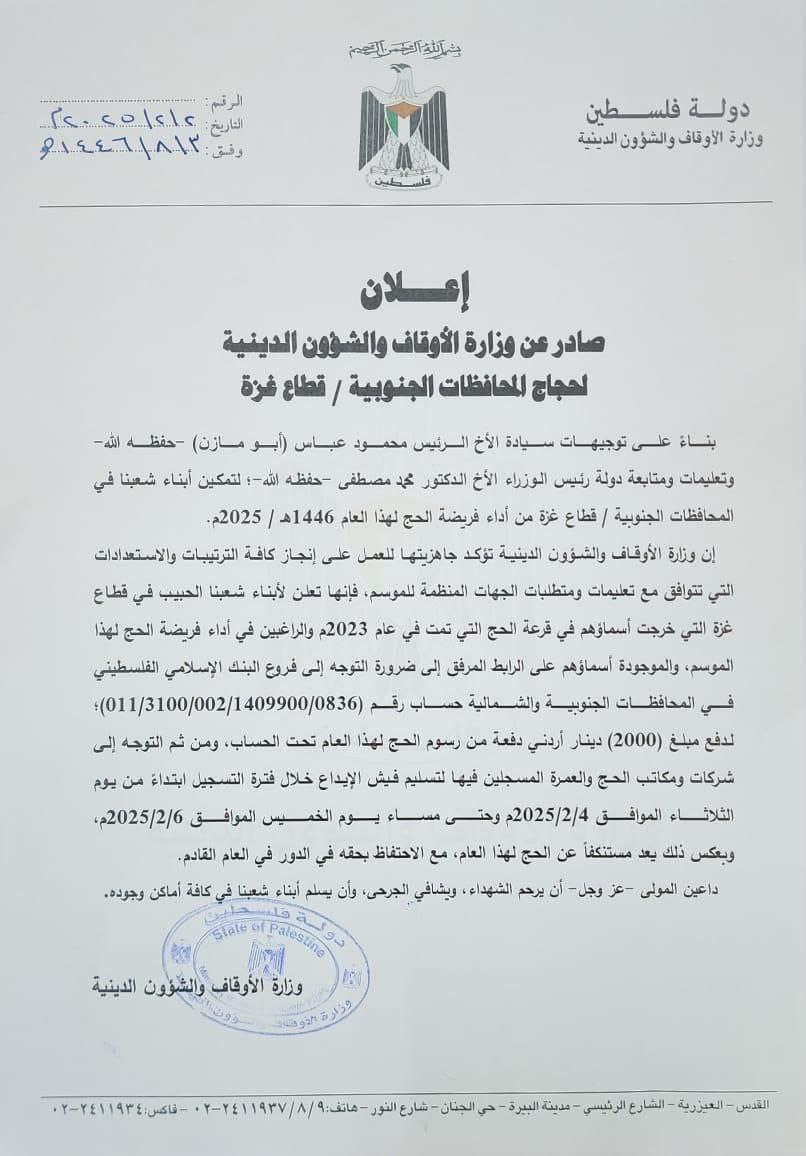 أصدرت وزارة الأوقاف مساء اليوم تنويهاً هاماً بشأن موسم الحج لسكان قطاع غزة.