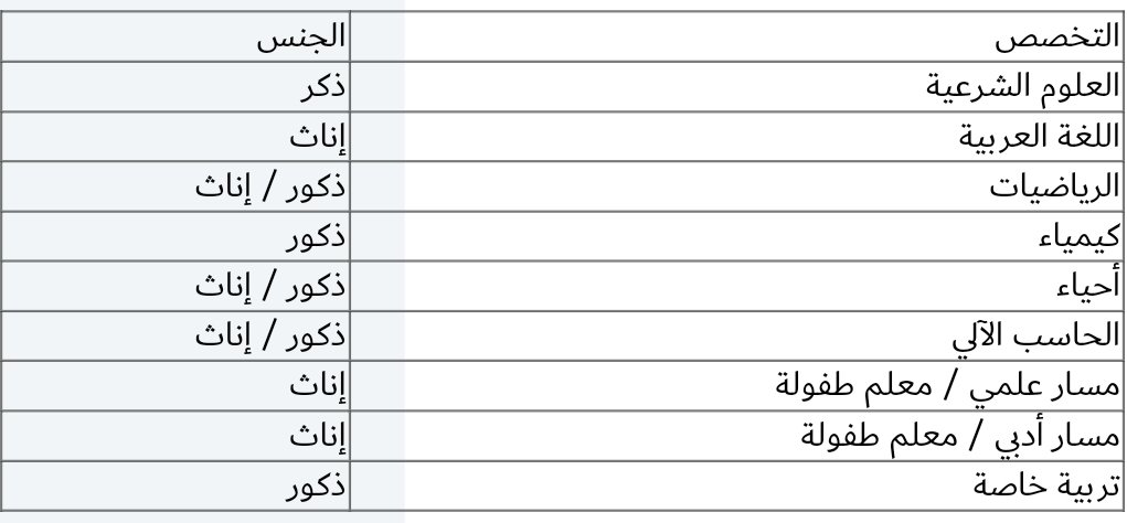 درجة البكالوريوس في مادة التخصص من غير كلية التربية بتقدير لا يقل عن جيد جدًا ولديه مؤهل تربوي وخبرة تدريس لا تقل عن 3 سنوات.
