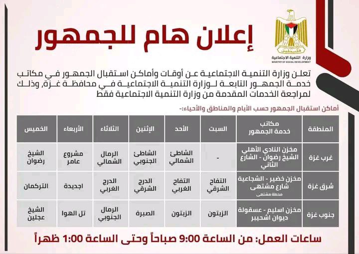 وزارة التنمية الاجتماعية تصدر إعلاناً هاماً للمواطنين بمحافظة غزة