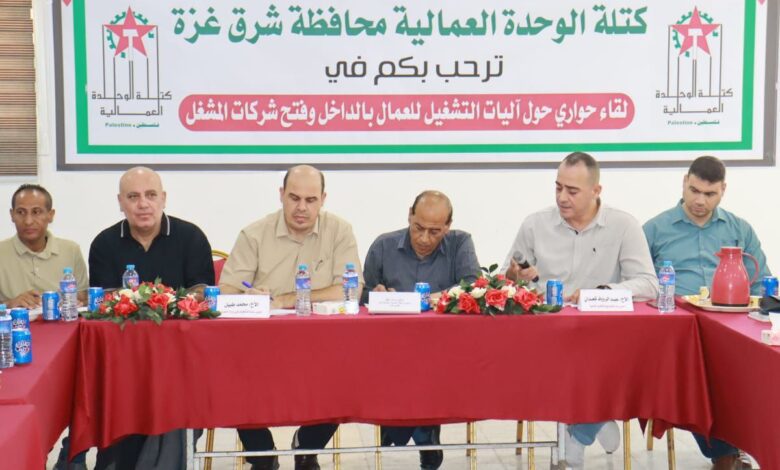 نظمت كتلة الوحدة العمالية بمحافظة شرق غزة، اليوم الأحد، لقاءً حواريًا حول التصاريح وآليات التشغيل بداخل مناطق الـ48 ، في مقر اتحاد الشباب الديمقراطي الفلسطيني.