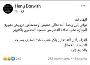 وأعلن شقيقه هاني درويش خبر وفاته عبر حساباته على مواقع التواصل الاجتماعي قائلا: “البقاء لله توفي إلى رحمة الله تعالى شقيقي مصطفي درويش تشييع الجنازة عقب صلاة العصر من مسجد الحصري بأكتوبر العزاء بإذن الله تعالى باكر عقب صلاة المغرب بمسجد الشرطة بالخمائل بالشيخ زايد”.