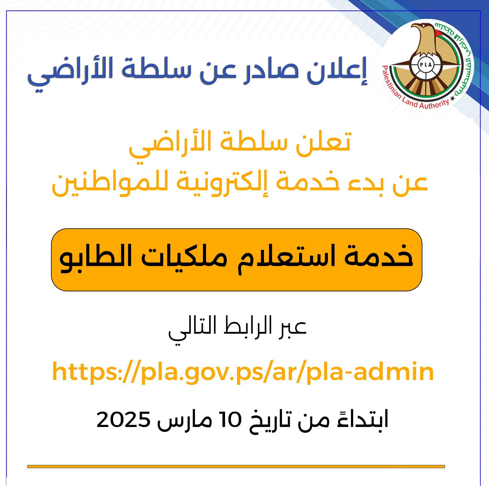 أعلنت سلطة الأراضي الفلسطينية عن إطلاق خدمة إلكترونية جديدة تتيح للمواطنين رابط الاستعلام عن ملكيات الطابو بشكل سريع وسهل، وذلك في إطار جهودها لتحسين الخدمات المقدمة وتسهيل الإجراءات على المواطنين.
