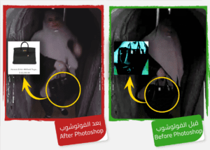 الصورة المتداولة مفبركة، تم فيها التعديل على شكل الحقيبة لتبدو مشابهة لحقائب العلامة التجارية الشهيرة (هيرميس بيركن)،