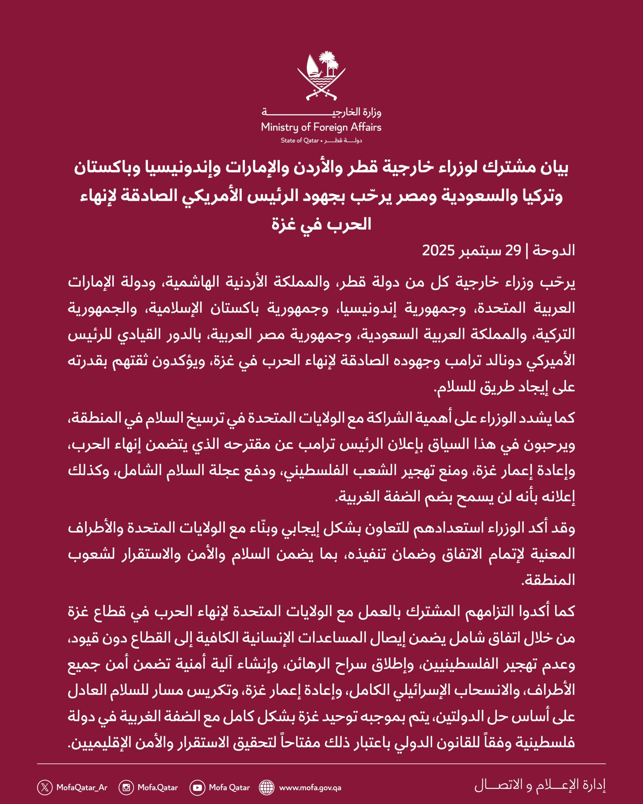 يرحب وزراء خارجية كل من جمهورية مصر العربية، والمملكة الأردنية الهاشمية، ودولة الإمارات العربية المتحدة، وجمهورية إندونيسيا، وجمهورية باكستان الإسلامية، وجمهورية تركيا، والمملكة العربية السعودية، ودولة قطر بالدور القيادي للرئيس الأميركي دونالد ترامب وجهوده الصادقة لإنهاء الحرب في غزة، ويؤكدون ثقتهم بقدرته على إيجاد طريق للسلام.