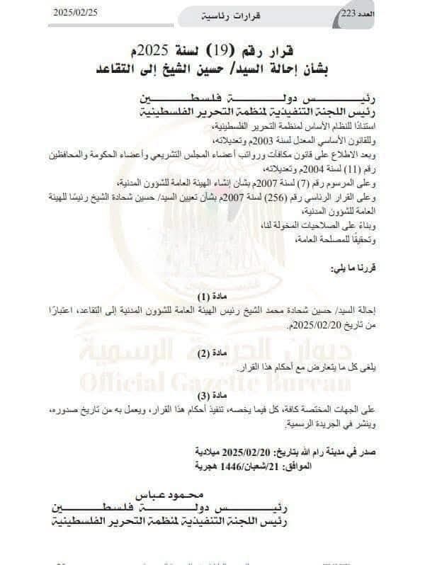 أصدر الرئيس الفلسطيني محمود عباس قرارًا يقضي بإحالة السيد حسين شحادة محمد الشيخ، رئيس الهيئة العامة للشؤون المدنية سابقًا، إلى التقاعد، وذلك اعتبارًا من 20 فبراير 2025.