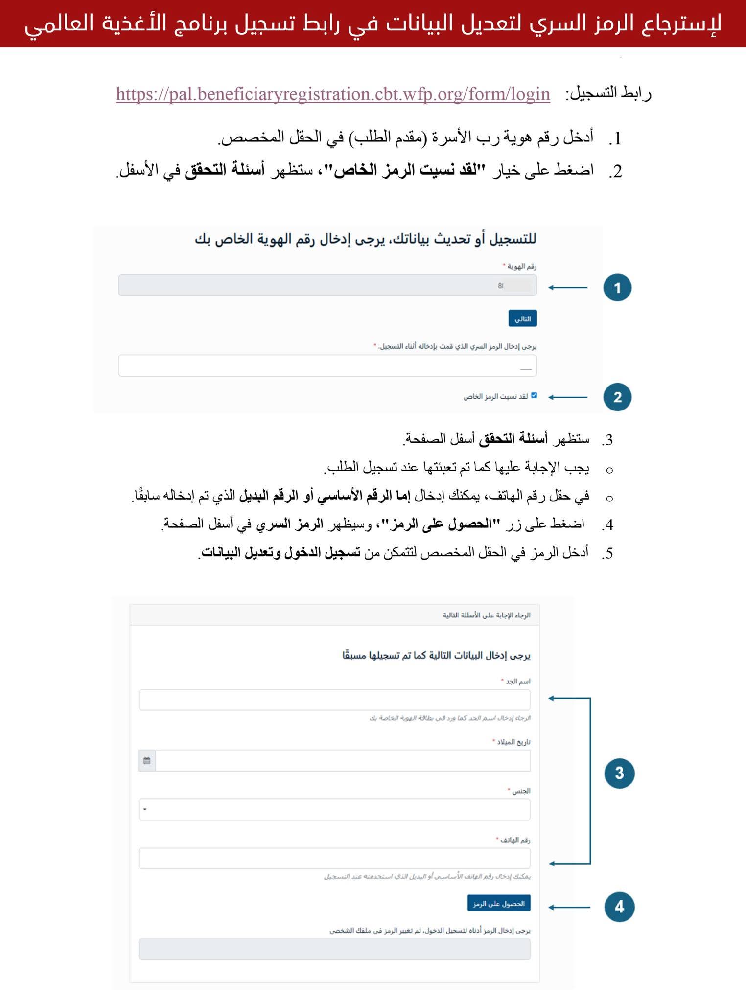 إذا فقدت الوصول إلى حسابك في برنامج الغذاء العالمي، فلا داعي للقلق. يُتيح البرنامج نظامًا إلكترونيًا آمنًا لاستعادة كلمة المرور بخطوات بسيطة دون الحاجة لمراجعة أي مركز: