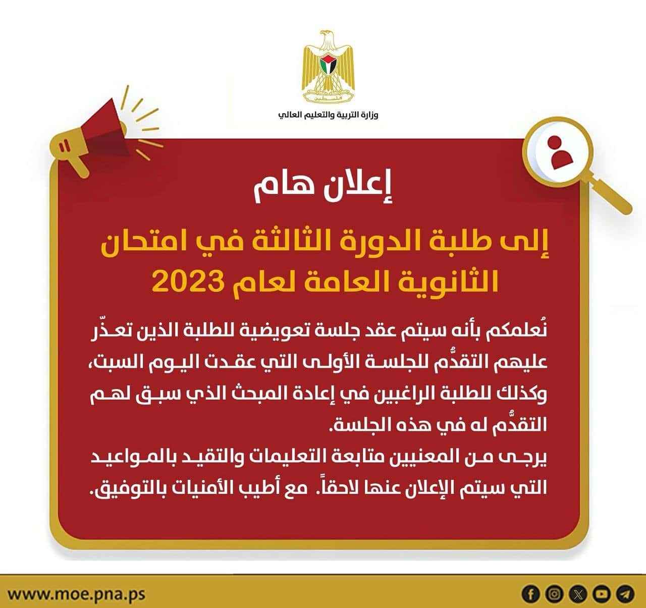 أعلنت وزارة التربية والتعليم الفلسطينية، اليوم السبت 19 يوليو 2025، في بيان صحفي لها، عن جلسة تعويضية لطلبة الدورة الثالثة في توجيهي 2023 لطلاب قطاع غزة .
