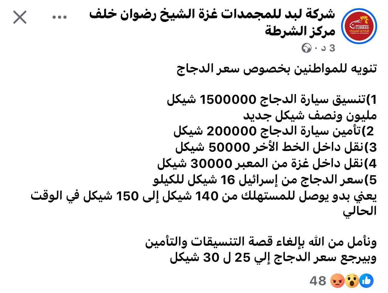 وبينت أن سعر الكيلو الواحد من الدجاج في السوق الإسرائيلية يبلغ 16 شيكلًا، إلا أن هذه الرسوم ترفع سعره عند المستهلك في غزة إلى ما بين 140 و150 شيكلًا، وهو ما اعتبرته الشركة سعرًا غير مقبول.