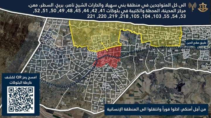 شمل الأمر مناطق بني سهيلا والحارات الشيخ ناصر، بربخ، السطر، معن، مركز المدينة، المحطة والكتيبة، بالإضافة إلى بلوكات 41، 42، 44، 45، 48، 49، 50، 51، 52، 53، 54، 55، 103، 104، 105، 218، 219، و220. وطلب الجيش من السكان في هذه المناطق الانتقال إلى المناطق التي يصفها بأنها إنسانية.