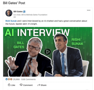 ونشر بيل غيتس على حسابه في «لينكد إن» مقطع الفيديو الخاص بالمقابلة، وعلق عليه قائلاً: «شاركت في مقابلة مع ريشي سوناك، أجراها روبوت محادثة يعمل بالذكاء الاصطناعي، وأجرينا محادثة رائعة حول المستقبل».