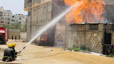 بالفيديو… إصابة 4 من عناصر الدفاع المدني بغزة خلال إخمادهم لحريق كبير