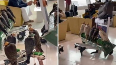 شاهد .. ثري خليجي يصطحب معه عشرات الصقور في مطار البحرين