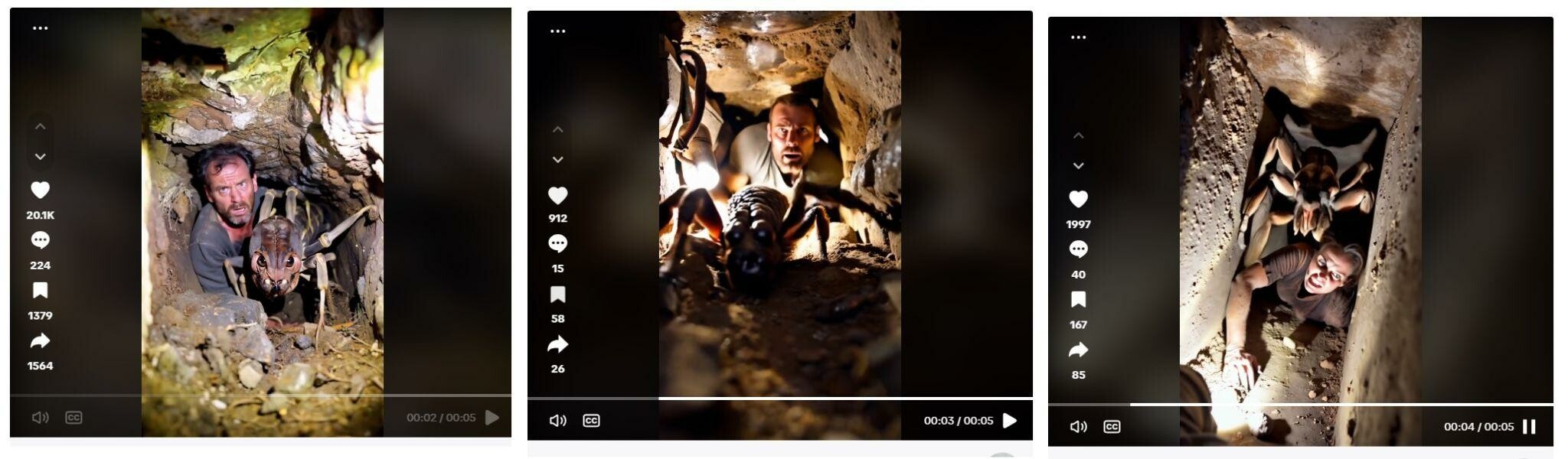 ويظهر في المقطع شاب يخرج من حفرة تحت الأرض، ممسكًا بعنكبوت ضخم في يده. وأشار الحساب إلى أنّ الفيديو مولد بالذكاء الاصطناعي.
